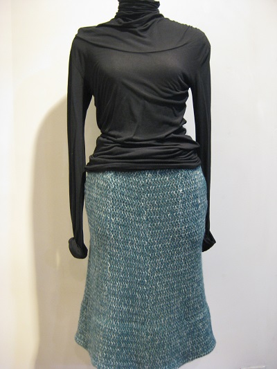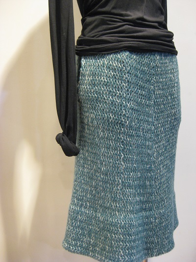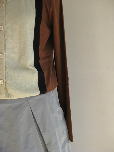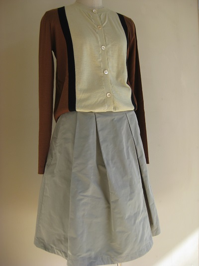 薄手のカシミアカーディガン+ポリエステルスカートの組み合わせ。