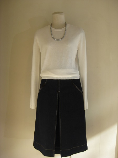 シンプルな白のセーターとデニムのスカートの組み合わせです。