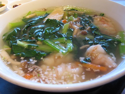 さて肝心の食事は、海老と青菜のスープ麵に
