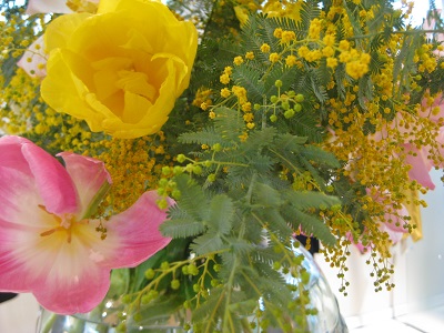 チューリップにミモザが加わり